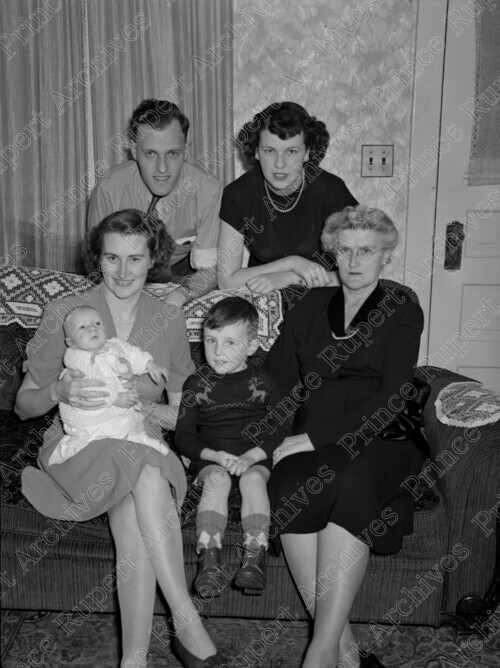 Scope & Content: Item consists of Mrs. Rice sitting down on the far right posing for a photograph with her son Lloyd standing on the left and his wife Libbie, two children and another woman. Handwritten annotation on recto of copy 2 reads: "Pr. Rupert. Sister. Mrs. Rice & Son Lloyd & Wife & Children. Nov. 1947." Stamped annotation on verso of copy 2 reads: "Photo by Jack Wrathall Prince Rupert, B. C."