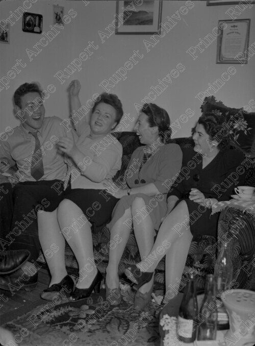 Scope & Content: Item consists of a man sitting on a couch with three women at a party for Joe LeBlanc at the nurses residences at Miller Bay Indian Hospital. Pictured from left to right is: an unidentified man, a woman called Lucky, Ms. Morton and Mrs. Jock McDonald. Handwritten annotation on recto of copy 2 reads: "1. 2. Lucky. 3. Miss Morton. 4. Mrs. Jock McDonald. At Party for Joe La Blanc [sic] Miller Bay Hospital 1947."