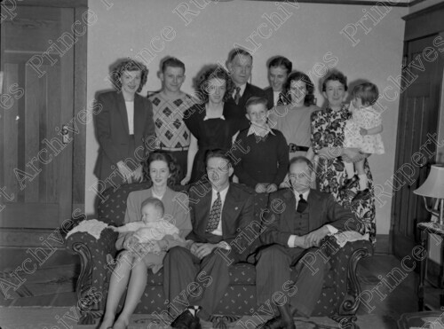 Scope & Content: Item consists of ten male and female adult members of the Skog family along with three children posing for a photograph in a living room in 1948. Pictured in the back row from left to right is: Evelyn Skog, Ivar Wahl, Mary Wahl, Olaf Skog, George Skog, Alexander (Scotty) Duncan, Winnie Duncan, Mrs. Skog and Darlene Skog. Pictured first from the left in the front row is a woman named Anne. Handwritten annotation on recto of copy 2 reads: "Mr. & Mrs. Skog's & Family 1948." Stamped annotation on verso of copy 2 reads: "Photo by Jack Wrathall Prince Rupert, B. C."