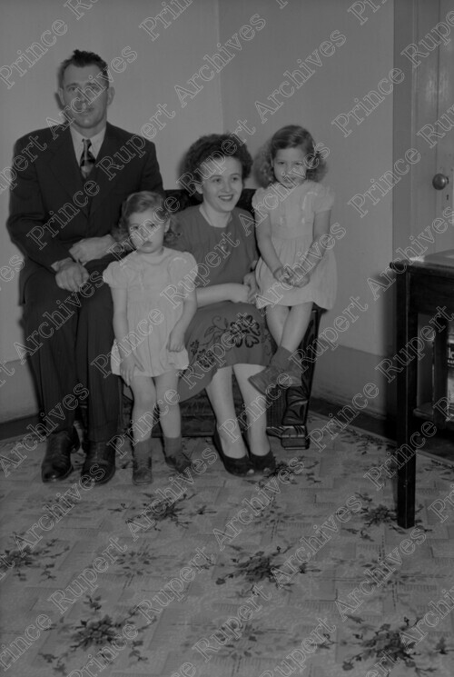 Scope & Content: Item consists of Ed Storey standing on the left as his wife (Lena?) sits in a chair with their two daughters as they pose for a photograph. Ed worked for the CN Railway. Handwritten annotation on recto of copy 2 reads: "At Salvas, B. C. C.N. Man. Mr. & Mrs. Ed. Storey & Girls. Mar. 20 - 1948." Stamped annotation on verso of copy 2 reads: "Photo by Jack Wrathall Prince Rupert, B. C."
