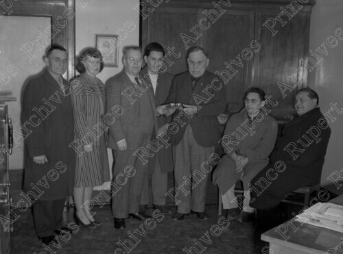Scope & Content: Item consists of members of the Indigenous Clifton family from Hartley Bay presenting a donation to Indian Agent Frank Anfield at an unknown location. Pictured from left to right is: Lewis Clifton, Phyllis Batt, Frank Anfield, Heber Clifton Jr., Chief Heber Clifton, Johnny Clifton and Ambrose Robinson. Handwritten annotation on recto of copy 2 reads: "Mr Anfield. Indian Agent. Donation from Natives. 1948." Stamped annotation on verso of copy 2 reads: "Photo by Jack Wrathall Prince Rupert, B. C."