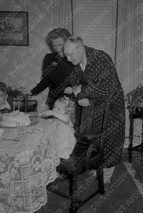 Scope & Content: Item consists of Dr. Cecil Hankinson and his wife Ida Hankinson watching as their young daughter Cherie cuts a cake at an unknown location. Handwritten annotation on recto of copy 2 reads: "Dr & Mrs Hankinson & Daughter. Jan - 1948." Stamped annotation on verso of copy 2 reads: "Photo by Jack Wrathall Prince Rupert, B. C."