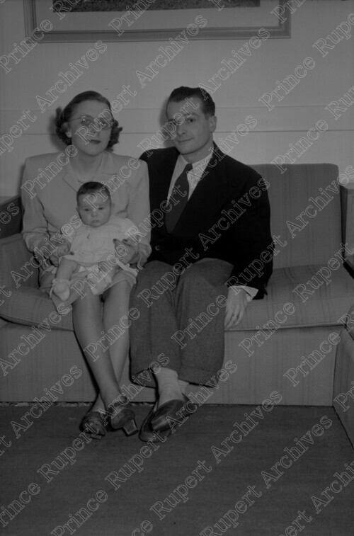 Scope & Content: Item consists of Florence Hood on the left with baby Barbara Hood on her lap sitting next to her husband Ralph Hood as they pose for a family photograph at an unknown location. Handwritten annotation on recto of copy 2 reads: "Was - Florence Parker. Mr. & Mrs. Florence & Ralph Hood. Dec. 1948."