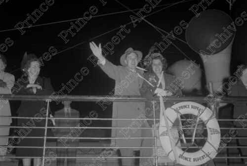Scope & Content: Item consists of Sven Whyte and Marjorie Whyte (nee Eby) waving goodbye from the deck of a ship at an unknown location. Handwritten annotation on recto of copy 2 reads: "July. 1949." Stamped annotation on verso of copy 2 reads: "Photo by Jack Wrathall Prince Rupert, B. C."