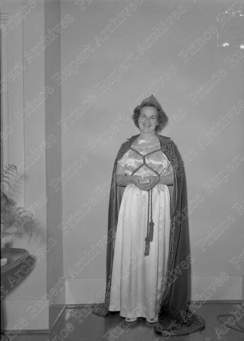 Scope & Content: Item consists of Heather Brewer wearing a crown and a cape at an unknown location. Handwritten annotation on recto of copy 2 reads: "Heather Brewer. Nov. 1951." Stamped annotation on verso of copy 2 reads: "Photo by Jack Wrathall Prince Rupert, B. C."