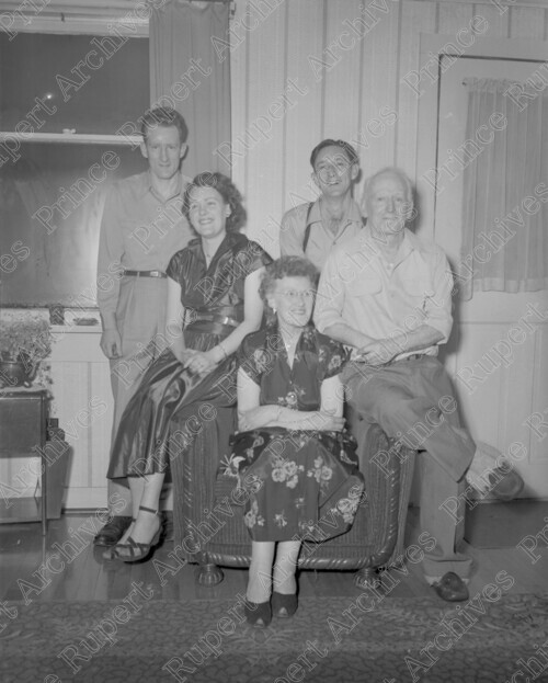 Scope & Content: Item consists of members of the Hanley and Holbrook family gathered around a chair. Pictured from left to right is: Vic Hanley, Geraldine Holbrook, Elsie Hanley, Art Holbrook and Jerry Hanley. Handwritten annotation on recto of copy 2 reads: "1. Vic. Hanley. 2 & 3. Mr. & Mrs. Geraldine & Art. Holbrook. Daughter. Mr. & Mrs. Elsie & Jerry Hanley & Family. Alfred. St. 1952." Stamped annotation on verso of copy 2 reads: "Photo by Jack Wrathall Prince Rupert, B.C."