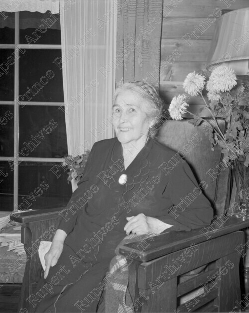 Scope & Content: Item consists of Mrs. George Frizzell sitting in a chair in a living room at an unknown location. Handwritten annotation on recto of copy 2 reads: "Mrs. George Frizzell. 1952." Stamped annotation on verso of copy 2 reads: "Photo by Jack Wrathall Prince Rupert, B. C."