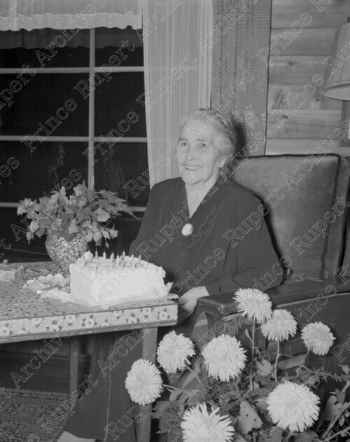 Scope & Content: Item consists of Mrs. George Frizzell sitting at a table with a birthday cake in front of her in 1952.