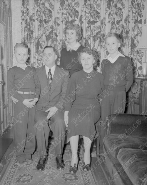 Scope & Content: Item consists of the Helland family at an unknown location. Pictured from left to right is: Peter Helland, Harold Helland, Sylvia Helland, Mrs. Helland and Roy Helland. Handwritten annotation on recto of copy 2 reads: "Roy. Mr. & Mrs. Harold. Helland & Family. 1953." Stamped annotation on verso of copy 2 reads: "Photo by Jack Wrathall Prince Rupert, B. C."
