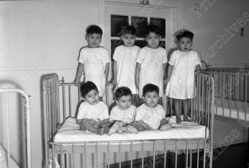 Scope & Content: Item consists of a group of seven young First Nations boys all patients at Miller Indian Bay Hospital sitting on a bed and wearing hospital gowns. Handwritten annotation on recto of copy 2 reads: "Indian Children - Patients - Miller Bay Hospital. Apr. 28. 1955." Stamped annotation on verso of copy 2 reads: "Photo by Jack Wrathall Prince Rupert, B. C."