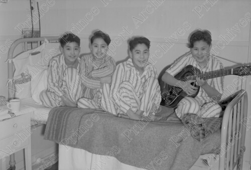 Scope & Content: Item consists of four Indigenous youth all patients at Miller Bay Indian Hospital sitting on a bed and wearing pajamas. One youth is holding a guitar. Handwritten annotation on recto of copy 2 reads: "Indian Children - Patients - Miller Bay Hospital. Apr. 28-1955." Stamped annotation on verso of copy 2 reads: "Photo by Jack Wrathall Prince Rupert, B. C."