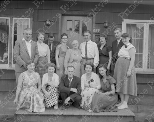 Scope & Content: Item consists of fourteen male and female members of the Botrokoff family standing outside the home at 431 6th Avenue West in Prince Rupert. Handwritten annotation on recto of copy 2 reads: "1959. Mr. & Mrs. Botrokoff & Family & Husbands. 400 Blk - 6th. Ave. W." Stamped annotation on verso of copy 2 reads: "Photo by Jack Wrathall Prince Rupert, B. C."