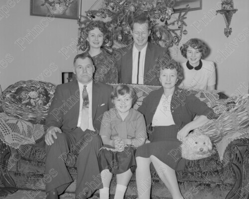 Scope & Content: Item consists of J. and Ester Johnson and their four children posing for a photograph in a living room with a Christmas tree in the background on January 2, 1959.