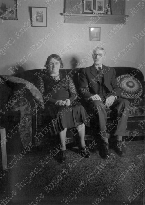 Scope & Content: Item consists of Mrs. and Mr. Dingwell sitting on a couch and posing for a photograph at a house on the 100 block of 5th Avenue East. Handwritten annotation on recto of copy 2 reads: "Mr. & Mrs. Dingwell. 100 Blk. 5th. Ave. E. 1936." Stamped annotation on verso of copy 2 reads: "Photo by Jack Wrathall Prince Rupert, B. C."