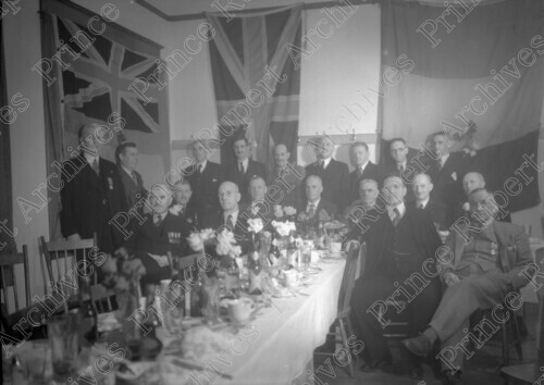 Scope & Content: Item consists of a group of men sitting around a table for the 1938 Old Timers Banquet at an unknown location. Some people pictured include: Bob Cameron, Mr. Johnson, Jack Priest, Mr. Rivett, Mr. McCauther, Bill Murray, Steve King, Syd Thomson and Mr. Raymond. Handwritten annotation on recto of copy 2 reads: "Old Timers Banquet. 1938." Stamped annotation on verso of copy 2 reads: "Photo by Jack Wrathall Prince Rupert, B. C."