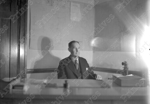 Scope & Content: Item consists of Mr. Brady the courthouse engineer sitting at a desk at an unknown location. Handwritten annotation on recto of copy 2 reads: "Mr. Brady. Engineer. Court House. 1940." Stamped annotation on verso of copy 2 reads: "Photo by Jack Wrathall Prince Rupert, B. C."