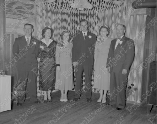 Scope & Content: Item consists of Pat and Dale Laird in the middle standing at their wedding. On the left is another couple and on their right is Mr. and Mrs. Ken Laird. Handwritten annotation on recto of copy 2 reads: "5-6. Mr. & Mrs. Ken Alaird [sic]. Mr. & Mrs. Alaird [sic] - Wedding. 1954." Stamped annotation on verso of copy 2 reads: "Photo by Jack Wrathall Prince Rupert, B. C."