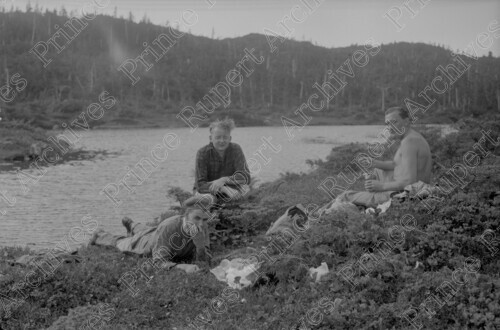 Scope & Content: Item consists of George Attrill (left), Jack Wrathall (middle) and a man (right) having a picnic while climbing Mount Baldy above Prudhomme Lake. Handwritten annotation on recto of copy 2 reads: "1. Geo. Attrill. 2. Jack Wrathall. 3. Climbing Mt. Baldy. Above Pudholme [sic] Lake. 1943." Stamped annotation on verso of copy 2 reads: "Photo by Jack Wrathall Prince Rupert, B. C."