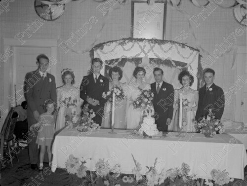 Scope & Content: Item consists of Pat Judd (nee Love) and her husband Mr. Judd standing amongst guests on their wedding day in September 1946. Handwritten annotation on recto of copy 2 reads: "Mr. & Mrs. Pat & Judd." Stamped annotation on verso of copy 2 reads: "Photo by Jack Wrathall Prince Rupert, B. C."