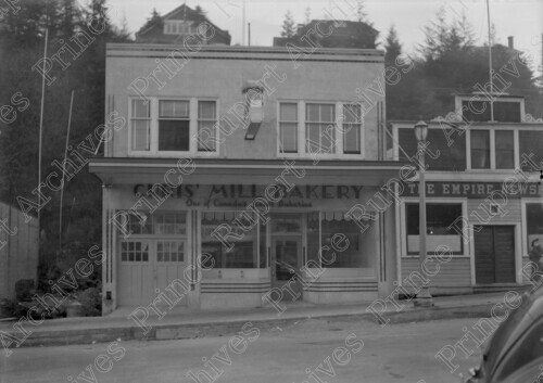 Scope & Content: Item consists of a view of the exterior of the Chris' Mill Bakery at 337 3rd Avenue West showing the Empire newspaper to the right and homes on 4th Avenue East in the background. Handwritten annotation on recto of copy 2 reads: "Christ Mill Bakery. 337 - 3rd. Ave. W. & The Empire News." Stamped annotation on verso of copy 2 reads: "Photo by Jack Wrathall Prince Rupert, B. C."