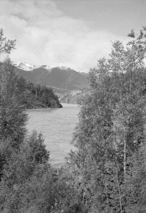 Scope & Content: Item consists of a view of the Skeena River and mountains in the background near Terrace, BC. Handwritten annotation on recto of copy 2 reads: "Skeena River. East of Terrace. 1953." Stamped annotation on verso of copy 2 reads: "Photo by Jack Wrathall Prince Rupert, B. C."