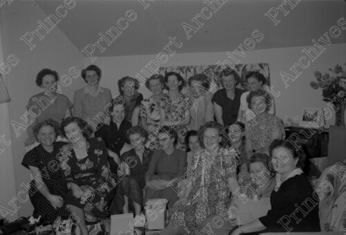 Scope & Content: Item consists of a large group of women sitting and standing in two rows for a party at Miller Bay Indian Hospital. Pictured in the front row from left to right is: Bertha Peterson, Mrs. Bob Harmer, Mrs. George Fowler, a woman, a woman, Marg Kelly, Elsie, Marg Pitt, Mrs. Bart Headstrom, Lucky and a woman. Pictured in the back row from left to right is: Dot Fletcher, Mrs. Lloyd Rice, Signe Jenson, Mrs. Helen Woodsides, Polly Roberts, a woman, Ester Johnson and a woman. Handwritten annotation on recto of copies 2 and 3 reads: "Shower Party. At Miller Bay Hospital. 1950." Stamped annotation on verso of copies 2 and 3 reads: "Photo by Jack Wrathall Prince Rupert, B. C."