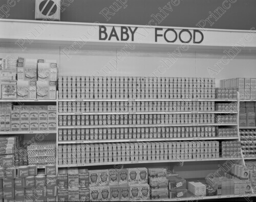 Scope & Content: Item consists of the opening day of Sheardown's Grocery at 316 3rd Avenue West in 1952, showing the baby food section of the store.