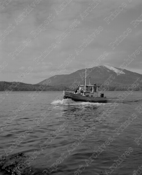 Scope & Content: Item consists of a view of the boat "KAMBN'1" showing four people aboard the vessel and Mount Morse in the distance. Handwritten annotation on recto of copy 2 reads: "KAMBN'1. 1951. Pr. Rupert, B.C." Stamped annotation on verso of copy 2 reads: "Photo by Jack Wrathall Prince Rupert, B. C."