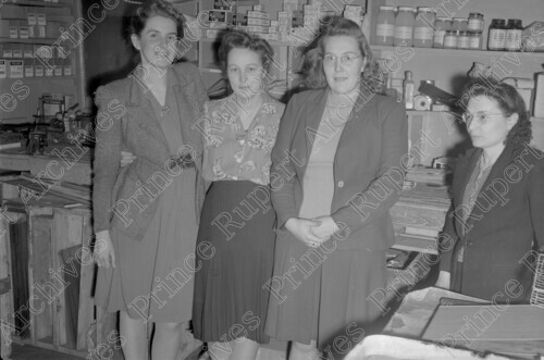 Scope & Content: Item consists of the staff of Wrathall's store in 1948. From left to right; Vivian Wrathall, Dot Fletcher, Evelyn McNab and Lucy Angley.
