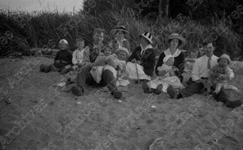 Scope & Content: Item consists of a group of men, women and children sitting at a beach on Tugwell Island on July 23, 1916. Pictured from left to right is: Jack Wrathall, Bill Wrathall, Mr. Rourke holding a child, Lydia (Lynn) Wrathall holding her daughter Audrey, Mrs. Rourke, Mrs. L. C. Presley holding a child and L. C. Presley holding a child. Handwritten annotation on verso of copy 2 reads: "1 - Jack Wrathall. 2 - Bill Wrathall. 3 - Mr Rourke & Child. 4 - Mrs - Lynn Wrathall & Audrey W. 5 - Mrs. Rourke. 6- Mr & Mrs. L. C. Presley & Children. Tugwell Isl. 1916."
