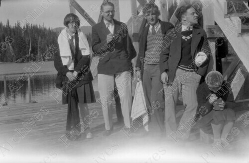 Scope & Content: Item consists of five people standing in front of a lake.