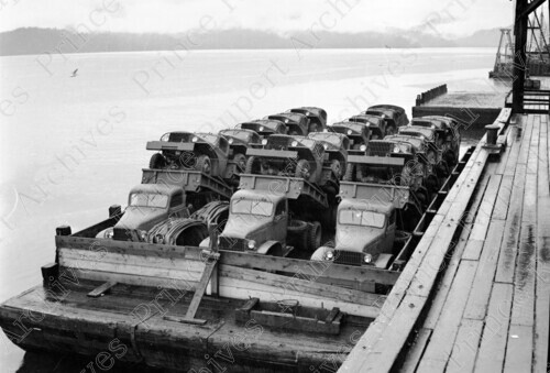 Scope & Content: Item consists of US Army vehicles on a barge at the Ocean Dock ready to be shipped from Prince Rupert to Alaska. Handwritten annotation on recto of copy 2 reads: "Prince Rupert. U.S. Army Vechecles [sic] going to Alaska. Ocean Dock. 1943." Stamped annotation on verso of copy 2 reads: "Photo by Jack Wrathall Prince Rupert, B. C."