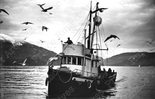 Scope & Content: Item consists of the fishing boat "Westjack" in a harbour (the Prince Rupert harbour?) with birds flying around it. Handwritten annotation on recto of copy 2 reads: "Westjack." Stamped annotation on verso of copy 2 reads: "HAL. Photo by Jack Wrathall Prince Rupert, B. C."