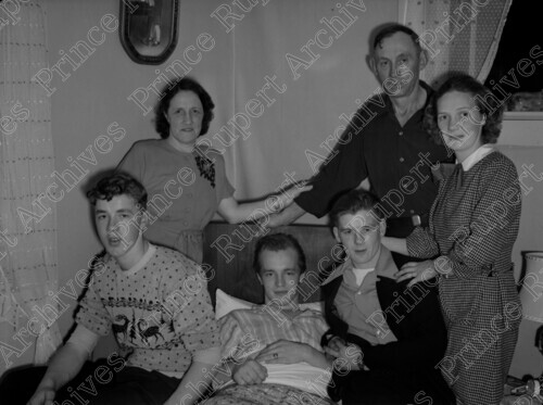 Scope & Content: Item consists of six members of the Wick family sitting on a couch. Pictured from left to right is: Ralph Wick, Mrs. Ruth Wick, Mr. John Wick, Mr. Henry Wahl, Mr. Ole Wick and Vi Wahl (nee Wick). Handwritten annotation on recto of copies 2 and 3 reads: "1. Ralph Wick. 2. Mrs. Wick. 3. 4. 5. Mr. Wick. 6." Stamped annotation on verso of copies 2 and 3 reads: "Photo by Jack Wrathall Prince Rupert, B. C."