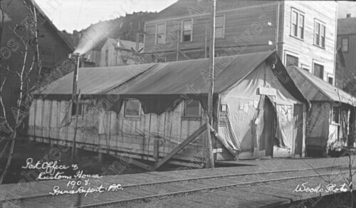 Scope & Content: Photograph depicts the post office and customs house. Caption reads "Post Office & Customs House 1908. Prince Rupert. B.C." Another caption reads "Woods Photo."