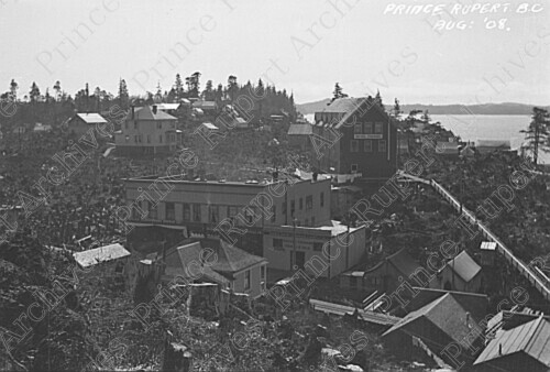 Scope & Content: Photograph depicts an aerial view of various buildings and homes including the Premier Hotel, Kelly Carruthers Supply Co. and the Prince Rupert Supply Co. The harbour can be seen in the background.