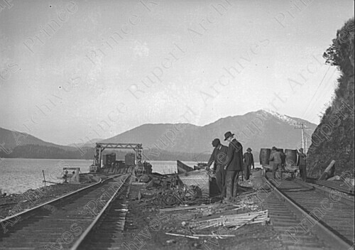 Scope & Content: Photograph depicts men working on railway tracks including two men moving barrels on a railway cart. A rail barge can be seen in the background. Mountains can also be seen in the background.