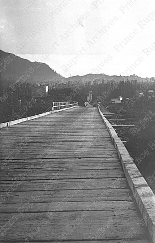 Scope & Content: Photograph depicts a wooden road running down 6th Avenue East and McBride Street.
