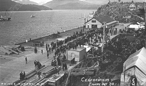 Scope & Content: Photograph depicts crowds of people gathered on a wharf during Empire Day. Caption on the lower left corner reading "Prince Rupert, B.C." Caption on the lower right side reading "Celebrations Empire Day 08." Caption on the lower right-hand corner reading "EAW."