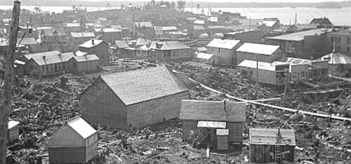 Scope & Content: Photograph depicts an aerial view of Fraser Street and 700 Block. The harbour can be seen in the background.