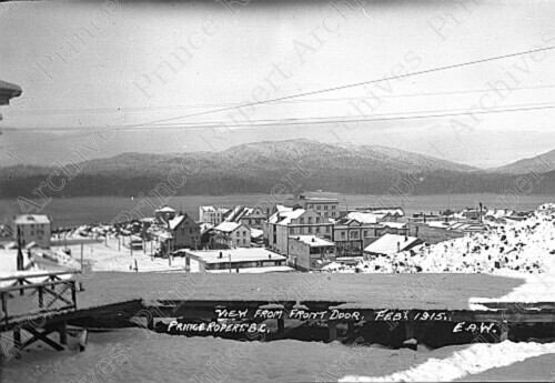 Scope & Content: Photograph depicts a view of Prince Rupert from E. A. Woods house of 500 Borden Street. The harbour and Mt. Morse can be seen in the background. Caption at the bottom of the photo reading "View from Front Door. Feb 1915. Prince Rupert. B.C. E.A.W."