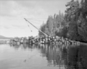 Title: Kelly Logging Co. Camp at Shannon Bay on Haida Gwaii, B.C. in 1950 Part of: Wrathall Photo Finishing Ltd. fonds Level: Item Date: 1950 Physical Description: ["1 nitrate negative : b&w ; 9.5 x 11.5 cm (referred to as copy 1)", "1 photograph : b&w ; 21 x 26 cm (referred to as copy 2)"] Description: Photograph depicts logs piled at the water's edge at Kelly Logging Co. camp with a crane in the background at Shannon Bay on Haida Gwaii. Handwritten annotation on recto of copy 2 reads: "Kelly Logging Co. Shannon Bay. Q. Ch. Isl. 1950." Stamped annotation on verso of copy 2 reads: "Photo by Jack » View details and larger image |