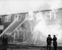 Title: Exchange Block Fire at 3rd Avenue and 6th Street at Prince Rupert, B.C. on February 22, 1959 Part of: Wrathall Photo Finishing Ltd. fonds Level: Item Date: Febraury 22, 1959 Physical Description: ["1 acetate negative : b&w ; 9.5 x 12 cm (referred to as copy 1)", "1 photograph : b&w ; 21 x 26 cm (referred to as copy 2)"] Description: Item consists of a fire destroying the Exchange Block on 3rd Avenue West and 6th Street. Firefighters can be seen spraying the building with fire hoses. Handwritten annotation on recto of copy 2 reads: "Exchange Blk. Fire. 3rd. Ave. & 6th. St. Feb. 22 - 1961." Stamped annotation on verso of copy 2 » View details and larger image |