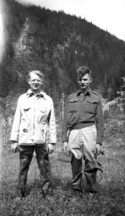 Title: Jack Wrathall and George Attrill at the Khyex River, B.C. in 1945 Part of: Wrathall Photo Finishing Ltd. fonds Level: Item Date: 1945 Physical Description: ["1 nitrate negative : b&w ; 10.5 x 6 cm (referred to as copy 1)", "1 photograph : b&w ; 26 x 21 cm (referred to as copy 2)"] Description: Item consists of Jack Wrathall, on the left, and George Attrill, on the right, wearing hip waders and in the water with a rowboat on the shore of the Khyex River. Handwritten annotation on recto of copy 2 reads: "Khyax [sic] River. Jack Wrathall. - Geo. Attrill. 1945." Stamped annotation on verso of » View details and larger image |