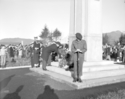 Title: Cenotaph at the Courthouse Grounds on Armistice Day at Prince Rupert, B.C. in 1959 Part of: Wrathall Photo Finishing Ltd. fonds Level: Item Date: November 11, 1959 Physical Description: ["1 acetate negative : b&w ; 9.5 x 12 cm (referred to as copy 1)", "1 photograph : b&w ; 11 x 13 cm (referred to as copy 2)"] Description: Item depicts a veteran laying a wreath at the Cenotaph on Market Place on Armistice Day. An honour guard of a solider and a navy sailor can be seen standing guard over the Cenotaph. A crowd of people can be seen in the background. Handwritten annotation on recto of copy 2 reads: "1959." View details and larger image |
