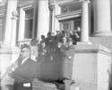 Title: People At The Front Of The Courthouse on Armistice Day at Prince Rupert, B.C. in 1959 Part of: Wrathall Photo Finishing Ltd. fonds Level: Item Date: November 11, 1959 Physical Description: ["1 acetate negative : b&w ; 9.5 x 12 cm (referred to as copy 1)", "1 photograph : b&w ; 11 x 13 cm (referred to as copy 2)"] Description: Item depicts a man playing the clarinet with others listening on the steps of the Prince Rupert Courthouse on Market Place on Armistice Day. Handwritten annotation on recto of copy 2 reads: "1959." View details and larger image |