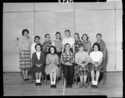 Title: 12 Students and a Teacher at Booth Memorial High School at Prince Rupert, B.C. in 1959 Part of: Wrathall Photo Finishing Ltd. fonds Level: Item Date: 1959 Physical Description: ["1 acetate negative : b&w ; 9.5 x 12 cm (referred to as copy 1)", "1 photograph : b&w ; 21 x 26 cm (referred to as copy 2)"] Description: Item consists of a group of 12 students and a teacher at Booth Memorial (Junior) High School. Pictured in the front row second from the left is Melody Shatfrord and fourth from the left is Maria Kiner. Pictured in the back row first on the left is teacher Ms. Smith, second from the left is Marlene » View details and larger image |
