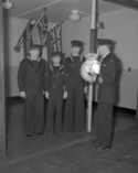 Title: H.M.C.S. Chatham at Prince Rupert, B.C. in 1952 Part of: Wrathall Photo Finishing Ltd. fonds Level: Item Date: September 6, 1952 Physical Description: ["1 acetate negative : b&w ; 13.5 x 10 cm (referred to as copy 1)", "1 photograph : b&w ; 26 x 21 cm (referred to as copy 2)"] Description: Item consists of four men from H.M.C.S. Chatham. Pictured from left to right is: Sid Alexander, Mr. Lavigne, Pete Peterson and Tom Johnston. Handwritten annotation on recto of copy 2 reads: "H.M.C.S. Chatham. Prince Rupert. 1952." Stamped annotation on verso of copy 2 reads: "Photo by Jack Wrathall » View details and larger image |