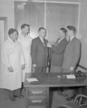 Title: Imperial Oil Men at Prince Rupert, B.C. in 1959 Part of: Wrathall Photo Finishing Ltd. fonds Level: Item Date: 1959 Physical Description: ["1 acetate negative : b&w ; 10 x 13.5 cm (referred to as copy 1)", "1 photograph : b&w ; 21 x 26 cm (referred to as copy 2)"] Description: Item consists of five employees of Imperial Oil sit inside the building on the wharf in Cow Bay. Those pictured include Dan Kristmanson, pictured farthest on the left, and Eric Christianson, pictured fourth from the left. Handwritten annotation on recto of copy 2 reads: "Imperial Oil Men. 1. Dan. » View details and larger image |