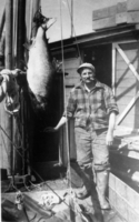 Title: Troller with a Large Salmon at Prince Rupert, B.C. in 1930 Part of: Wrathall Photo Finishing Ltd. fonds Level: Item Date: 1930 Physical Description: ["1 nitrate negative : b&w ; 13.5 x 8.5 cm (referred to as copy 1)", "1 photograph : b&w ; 26 x 21 cm (referred to as copy 2)"] Description: Item consists of a a man stands next to a large salmon on a troller. Handwritten annotation on recto of copy 2 reads: "Troller with Large Salmon. 1930. Pr. Rupert." View details and larger image |
